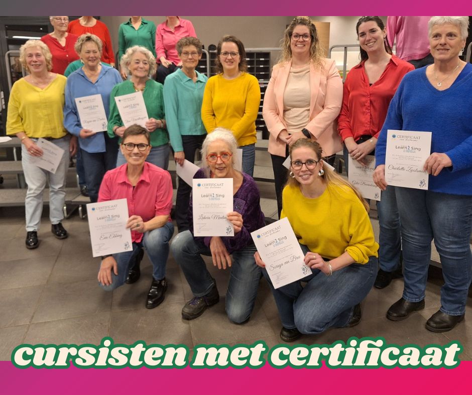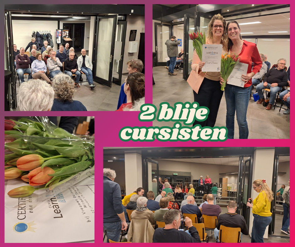 Zonder bladmuziek brengen we de twee songs ten gehore. Niet onverdienstelijk, al zeggen we dat zelf. Natuurlijk kan er nog wat aan geschaafd worden maar gezien de geringe tijd, zijn we zeer tevreden en hartstikke trots op onszelf. De cursisten krijgen van voorzitter Irene het Learn2Sing certificaat overhandigd en is het de hoogste tijd voor de afterglow. Nog even napraten en natuurlijk wordt er ook nog gezongen.