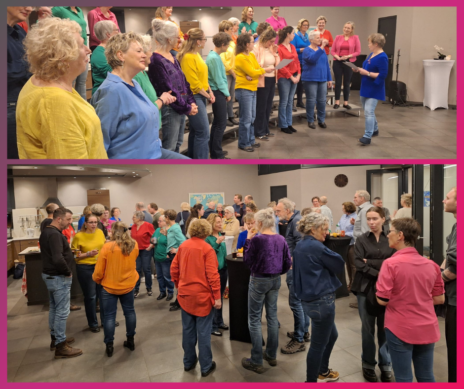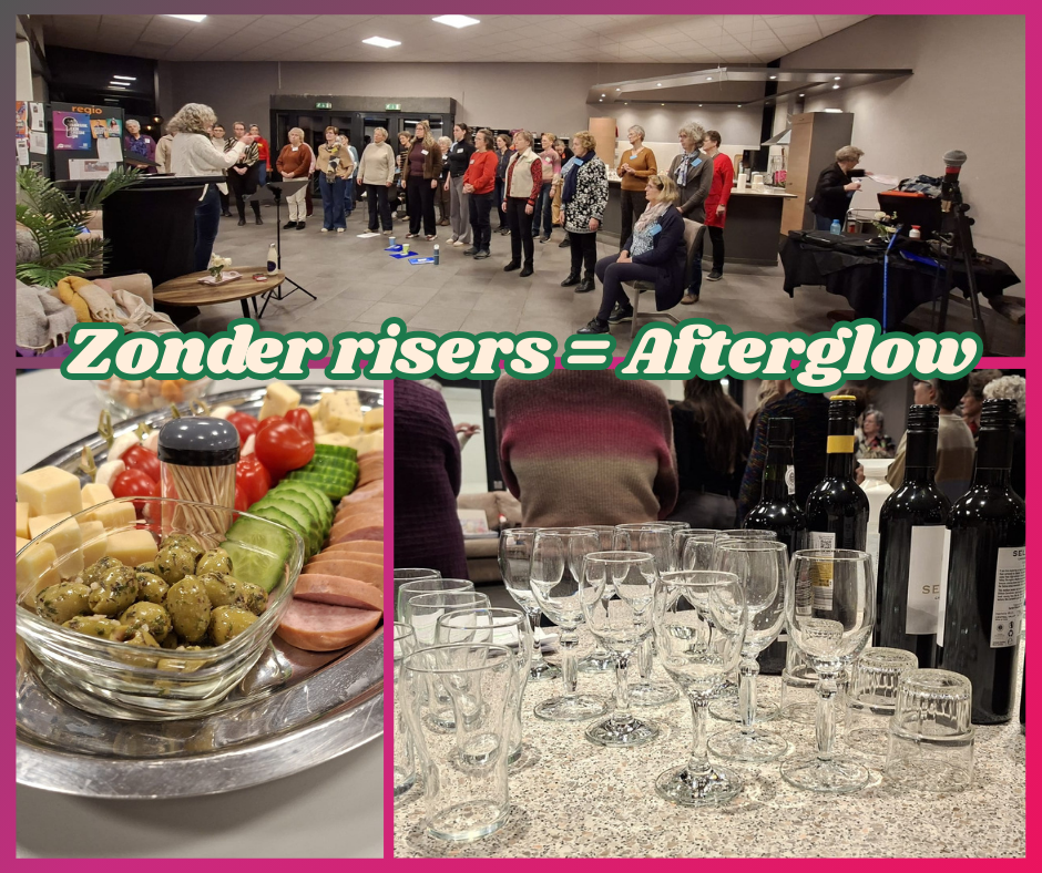 Wij houden doorgaans op de eerste donderdag van de maand onze afterglow. Een iets kortere repetitie en we zetten dan ook geen risers op. Zodoende zijn we sneller klaar en kunnen we gezellig aan een drankje en een plankje. De cursisten vielen dus met hun neus in de boter en hebben genoten van de gezelligheid met elkaar én brengen de koorleden nog een paar songs uit ons overige repertoire ten gehore.