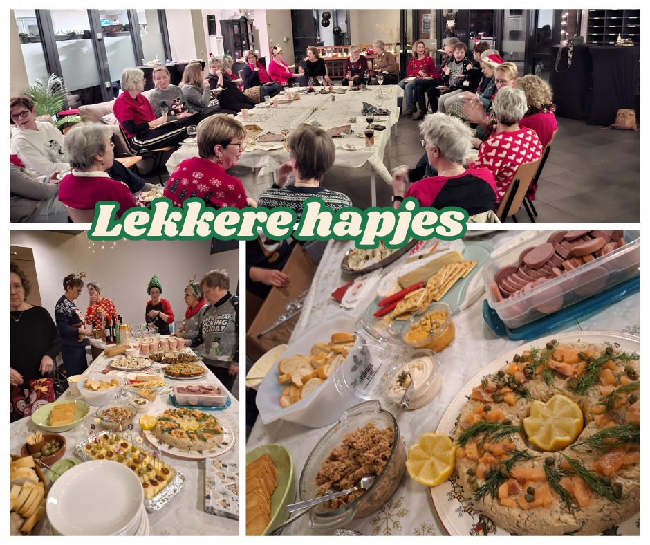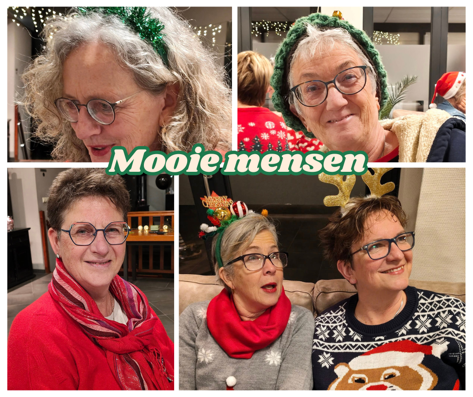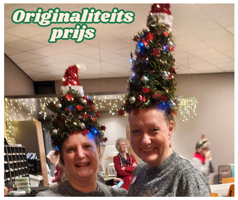 De originaliteitsprijs ging naar het duo Marlies en Irene. Wat een kunstwerk hadden die op hun hoofd geknutseld. Bleek nog aardig zwaar te zijn dus halverwege de avond werd de kerstmuts afgebroken.